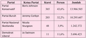 Pada Pemilu 2019, Boris Johnson yang sejak 23 Juli 2019 menjadi ketua Partai Kon­servatif, memenangkan pemilu, karena partai Konservatif, memenangkan 368 kursi par­lemen atau bertambah 50 kursi dari sebelumnya. Sedangkan Partai Buruh yang merupakan partai oposisi, memperoleh 191 kursi. Sisanya partai Demokrat Liberal men­dapat 13 kursi, Partai Brexit dan Partai Nasional Skotlandia 55 kursi.