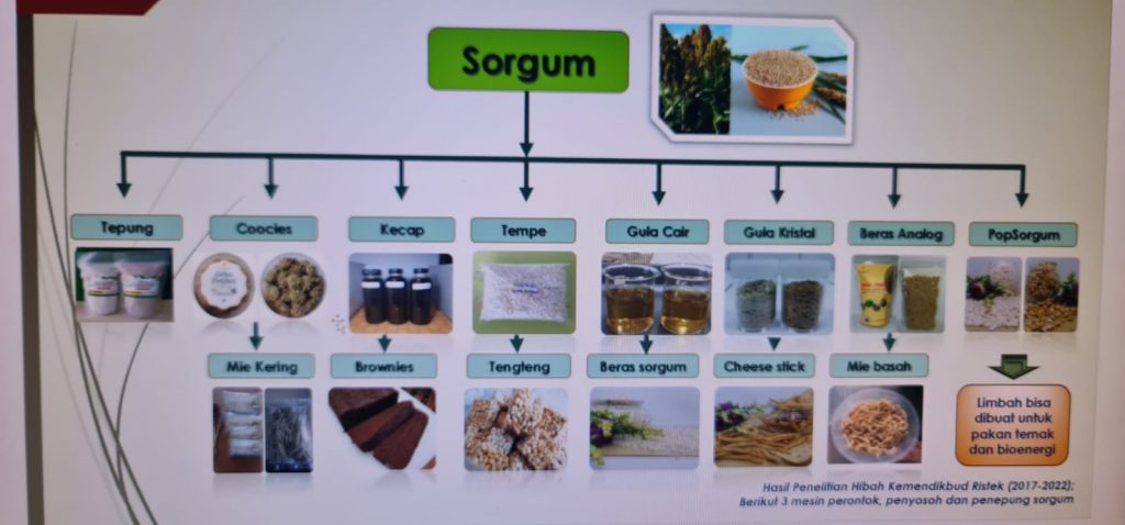 Selama penelitian, Prof. Wisnu telah membuat 14 produk dari bahan baku biji sorgum, yaitu tepung, kecap, tempe, gula cair, gula kristal, beras analog, beras sorgum, pop sorgum, mi kering, mi basah, brownies, tengteng, cookies, dan cheese stick.