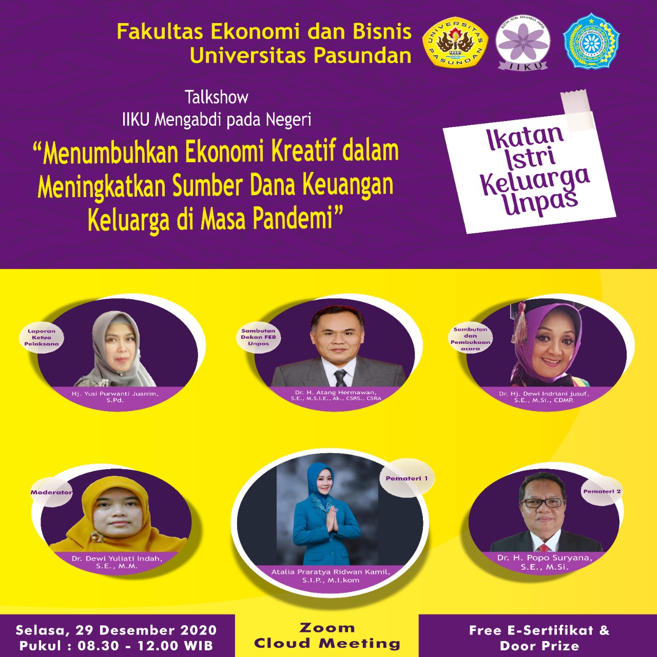 The event entitled “Menumbuhkan Ekonomi Kreatif dalam Meningkatkan Sumber Dana Keluarga di Masa Pandemi” was held on Tuesday, December 29th, 2020. It was also attended by lectures, staffs and others which was organized by Ikatan Istri dan Keluarga FEB UNPAS (IIKU-FEB UNPAS) and hosted by Atty Tri Juniarti. The event presented Atalia Praratya Ridwan Kamil, S.I.P., M.I.Kom (wife of West Java Governor), Dr. H. Popo Suryana, SE., M.Si and Dr. Hj. Dewi Indriani Jusuf, M.Si (Head of IIKU).