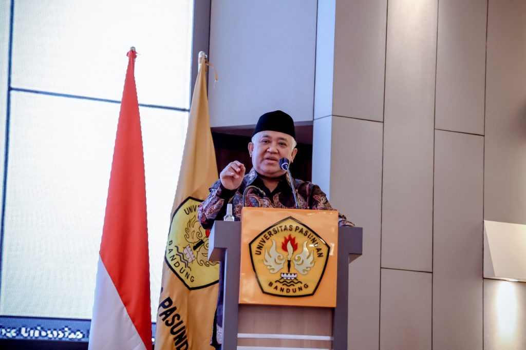 Mantan Ketua Umum PP Muhammadiyah Din Syamsudin mengisi tausiah pada peringatan Nuzulul Quran Unpas. (Foto: Rico B)