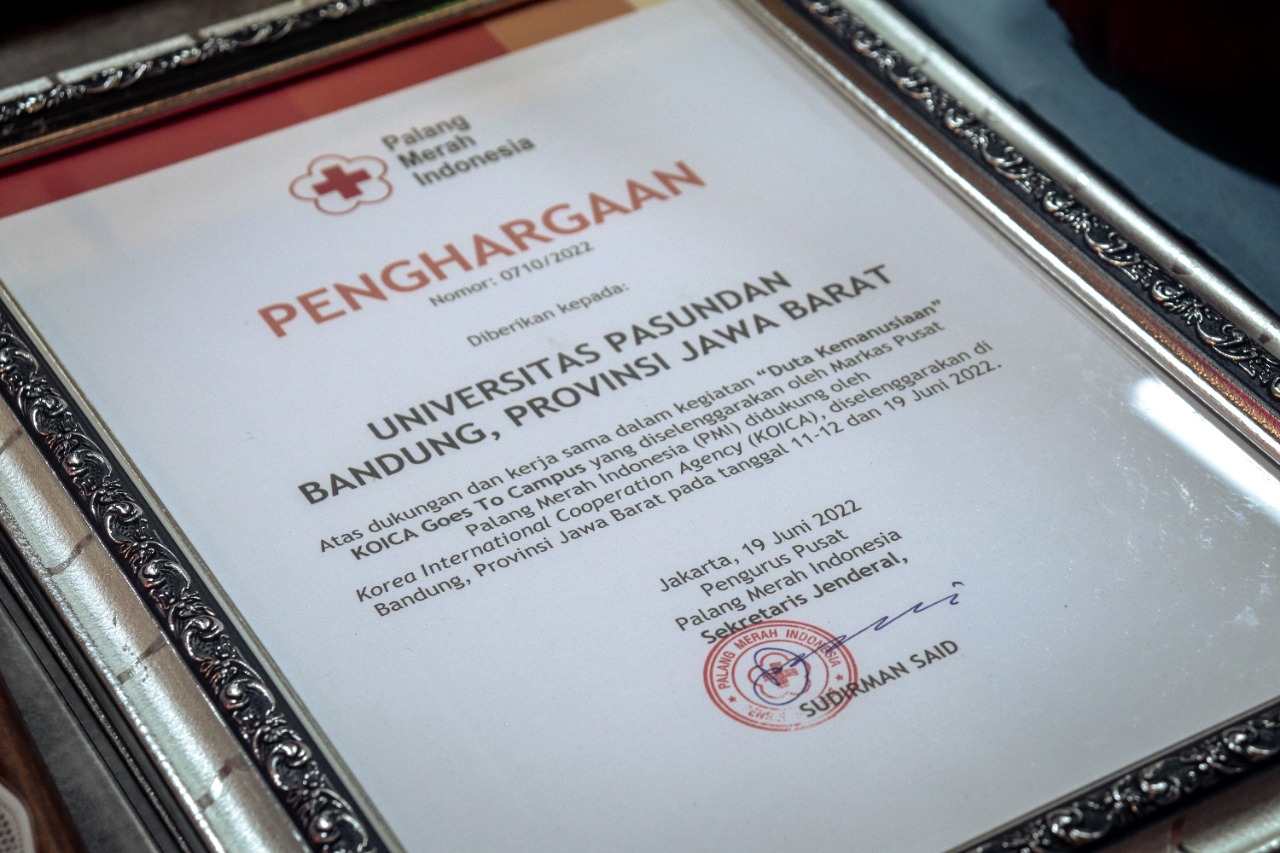 BANDUNG, unpas.ac.id – Universitas Pasundan dan UKM Korps Sukarela (KSR) PMI menerima penghargaan dari PMI Jawa Barat atas dukungan dan kerja sama dalam program “Duta Kemanusiaan” KOICA Goes to Campus, Jumat (9/9/2022).