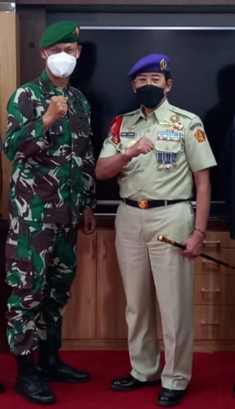 Komandan Resimen Mahasiswa Mahawarman Jabar, Prof. Dr. Ir. H. Eddy Jusuf Sp, M.Si., M.Kom. IPU. bersama Perwira Staf Ahli TK III KSAD Bidang Komsos, Mayjen TNI R.H. Karmin Suharna, S.I.P., M.A.