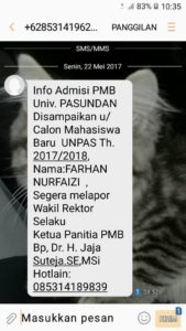 Selain itu, ada pesan dari si penipu melalui media sosial kepada para calon mahasiswa baru, antara lain sbb : “Info Admisi PMB Univ. PASUNDAN Disampaikan u/Calon Mahasiswa Baru UNPAS th. 2017/2018, nama : FARHAN NURFAIZI Segera melapor Wakil Rektor Selaku Ketua Panitia PMB Bp. Dr. H. Jaja Suteja, SE., M.Si. Hotlain : 085314189839”.