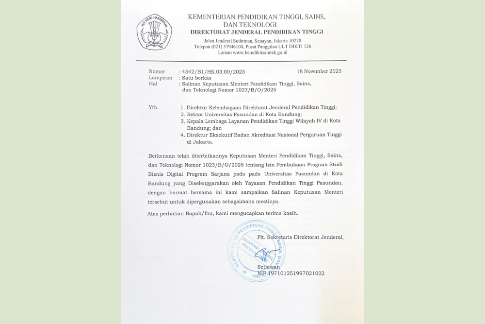 BANDUNG, unpas.ac.id — Fakultas Ekonomi dan Bisnis (FEB) Universitas Pasundan (Unpas) resmi menambah program studi baru setelah menerima Surat Keputusan (SK) Pendirian Prodi Bisnis Digital dari Kementerian Pendidikan, Kebudayaan, Riset, dan Teknologi Bidang Sains dan Teknologi (Kemdiktisaintek) Republik Indonesia.