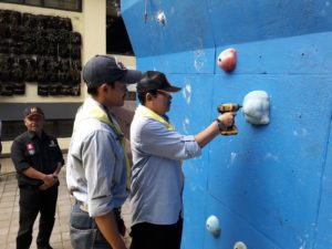 Rektor Unpas Prof. Dr. Ir. H. Eddy Jusuf Sp, M.Si., M.Kom memasang properti pada dinding panjat tebing sebagai tanda dimulainya Kejuaraan Panjat Tebing MASCC ke IV. Rektor didampingi Ketua Mapak Alam, Repa Maulana.*