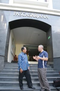 Rektor Unpas yang juga Ketua Bidang Pendidikan Tinggi Paguyuban Pasundan, Prof. Dr. Ir. H. Eddy Jusuf Sp, M.Si., M.Kom berbicang di beranda gedung Pascasarjana Unpas dengan Mr. Marcus Scott dari Politeknik Melbourne, setelah mengadakan pertemuan.