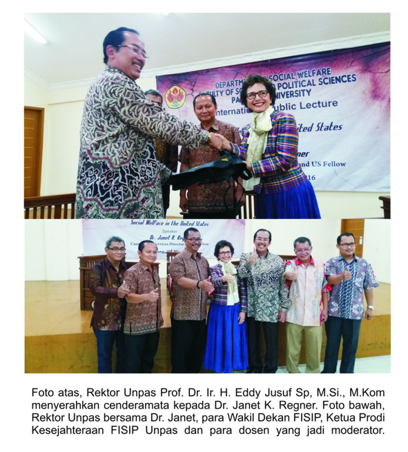Rektor Universitas Pasundan Prof. Dr. Ir. H. Eddy Jusuf Sp, M.Si., M.Kom hari Kamis 3 Maret 2016 membuka kuliah umum tentang “Kesejahteraan Sosial di Amerika” yang disampaikan pegiat sosial dari Amerika Dr. Janet K. Regner, di aula kampus FISIP Unpas Jl. Lengkong Besar, Bandung. Hadir pada acara ini para Wakil Dekan FISIP, Ketua Program Studi Kesejahteraan Sosial Unpas Dr. Abu Huraerah, M.Si, dan unsur pimpinan di FISIP lainnya.