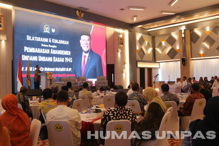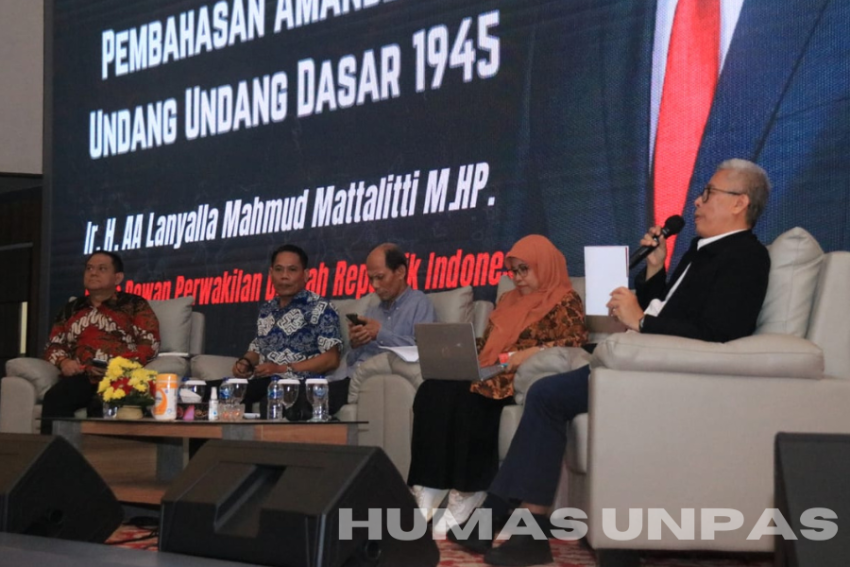 BANDUNG, unpas.ac.id – Ketua Dewan Perwakilan Daerah (DPD) RI, La Nyalla Mahmud Mattalitti menyinggung soal amandemen UUD 1945 tahun 1999 hingga 2002 dalam keynote speech-nya pada kunjungan dan diskusi publik di Universitas Pasundan, Jumat (25/8/2023).