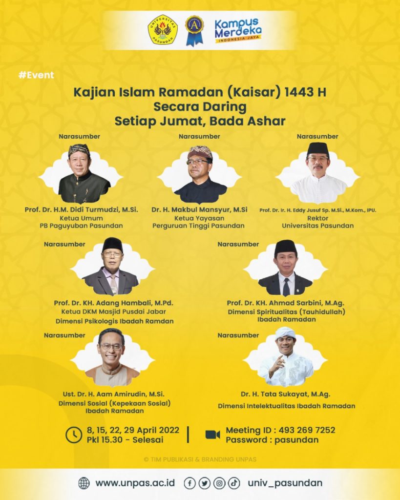 Talk show Ramadan akan diadakan setiap Jumat secara daring dengan narasumber Ketum PB Paguyuban Pasundan Prof. Dr. H. M. Didi Turmudzi, M.Si., Ketua YPT Pasundan Dr. H. Makbul Mansyur, M.Si., Rektor Unpas Prof. Dr. Ir. H. Eddy Jusuf Sp, M.Si., M.Kom., IPU, dan ulama.
