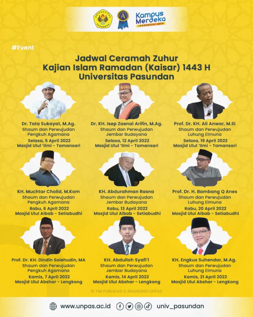 “Tiap harinya, narasumber yang mengisi kuliah zuhur berbeda-beda, namun seluruh temanya dikaitkan dengan misi Unpas, seputar shaum dan perwujudan pengkuh agamana, luhung elmuna, jembar budayana,” tambahnya.
