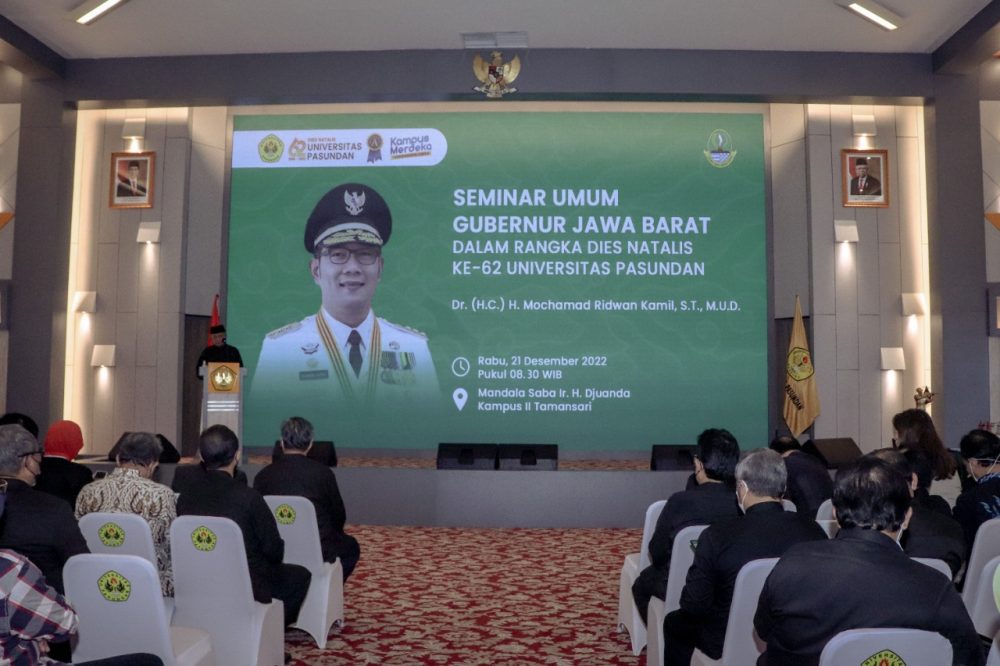BANDUNG, unpas.ac.id – Gubernur Jawa Barat Ridwan Kamil menyampaikan orasi ilmiah secara daring pada Puncak Dies Natalis ke-62 Universitas Pasundan, Rabu (21/12/2022).
