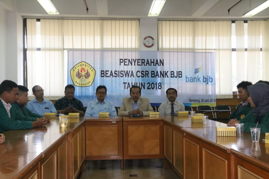 Penyerahan Beasiswa CSR Bank BJB Tahun 2018 sebesar Rp. 200.000.000,- (Dua Ratus Juta Rupiah) pada tanggal 26 Juni 2018. Beasiswa CSR Bank Bjb Langsung di serahkan Kepada Para Mahasiswa oleh Rektor Universitas Pasundan Prof. Dr. Ir. H Eddy Jusuf Sp.,M.Si.M.Kom didampingi oleh Pimpinan Bank BJB Cabang Tamansari , Wakil Rektor III , Wakil Rektor II dan Dekan Fakultas Teknik.