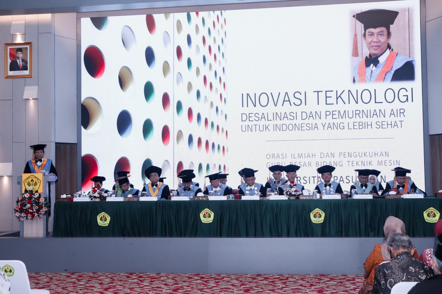 Prof. Hery saat orasi ilmiahnya pada Sabtu (4/5/2024) menjelaskan pada teknik flashing desalination/purification, air umpan berupa air keruh atau air asin disemprotkan di dalam sebuah vacuum chamber untuk mempercepat penguapan. Di dalam vacuum chamber terjadi pemisahan air tawar dan partikel padat pengotor atau garam atau cairan pekat, dimana partikel padat atau cairan pekat itu jatuh ke dasar chamber.