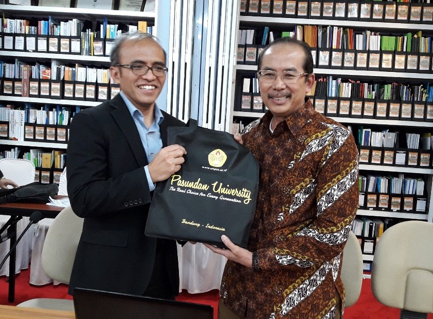 Orang Sunda yang jadi ilmuwan di Amerika Serikat, Prof. Deden Rukmana, Ph. D, (kiri) menerima cendera mata dari Rektor Universitas Pasundan Bandung Prof. Dr. Ir. H. Eddy Jusuf Sp, M.Si., M.Kom setelah Prof. Deden Rukmana membagikan ilmu dan pengalamannya kepada keluarga besar Universitas Pasundan hari Kamis 6 Desember 2018 dalam pertemuan di ruang rapat rektorat di Kampus IV Jl. Setiabudhi 193 Bandung.