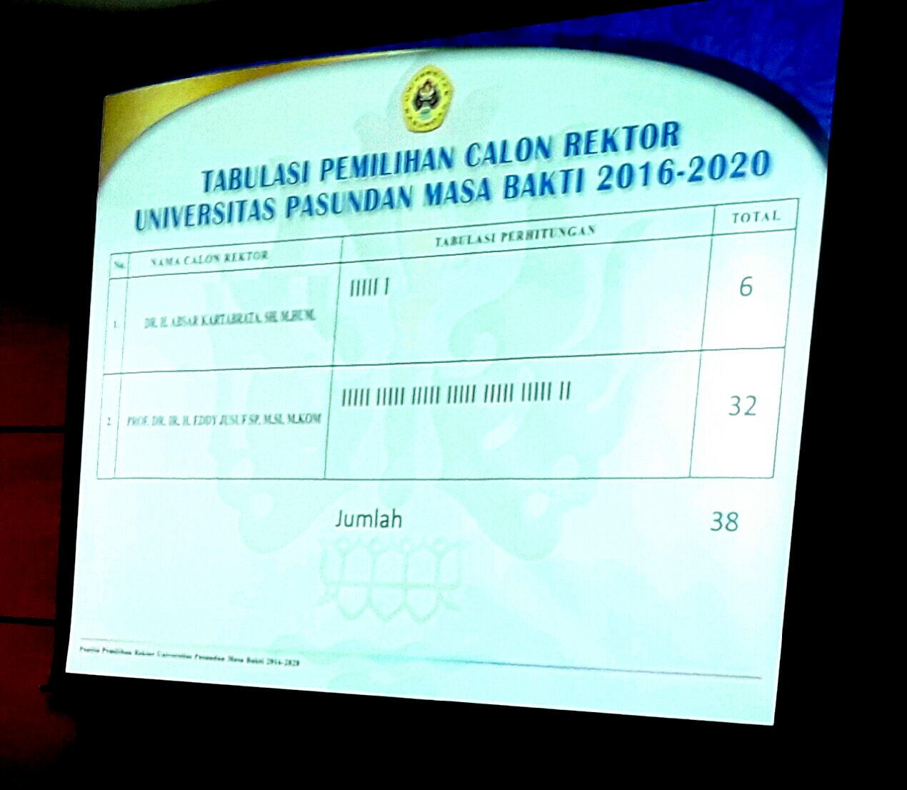 Calon Rektor UNPAS masa bakti 2017-2021, Prof. Dr. Ir. H. Eddy Jusuf Sp, M.Si., M.Kom memperoleh suara terbanyak (32 suara) dalam pemungutan suara yang dilaksanakan pada Rapat Senat Universitas Pasundan Bandung, Senin 9 Januari 2016 di aula Pascasarjana UNPAS Jl. Sumatera 41 Bandung. Sedangkan calon lainnya, Dr. H. Absar Kartabrata, M.Hum memperoleh 6 suara.