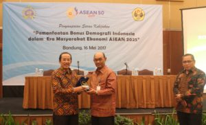 Rektor Unpas Prof. Dr. Ir. H. Eddy Jusuf Sp, M.Si., M.Kom (kiri) menerima cenderamata dari Direktur Kerjasama Ekonomi ASEAN Kemenlu RI, Ade Putranto setelah acara pembukaan seminar kerjasama ekonomi ASEAN di Hotel Preanger Bandung, Selasa 16 Mei 2017.