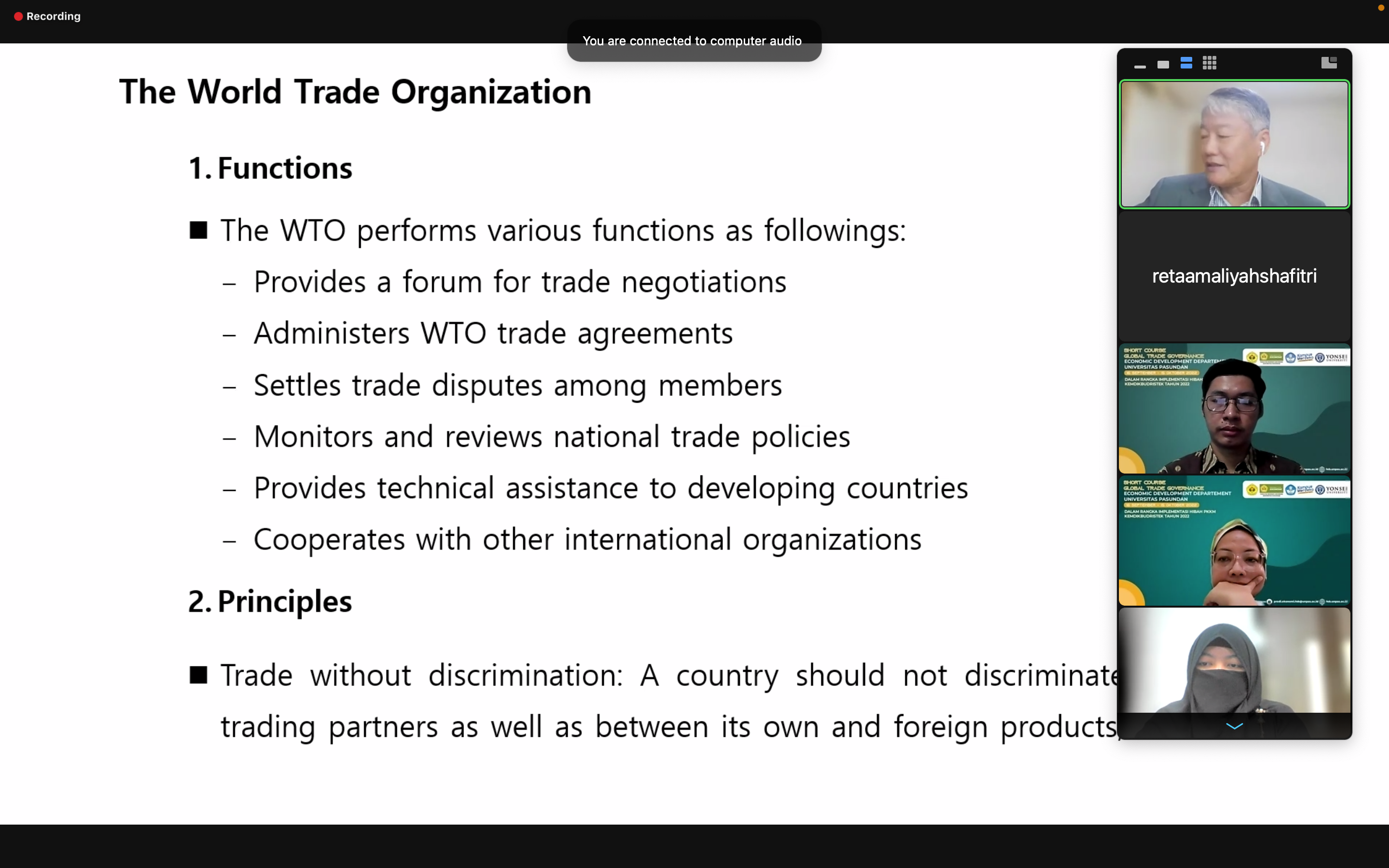 Pada pertemuan pertama dan kedua, Prof. Chae membahas topik sejarah, fungsi, dan prinsip global trade governance.