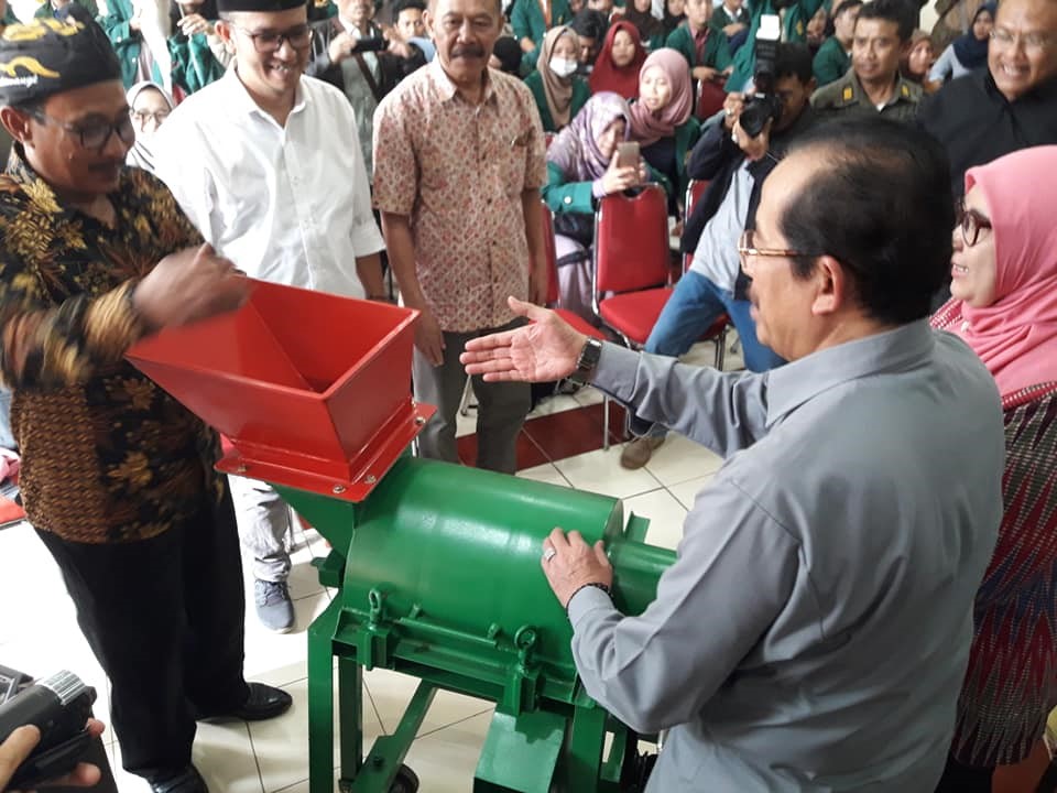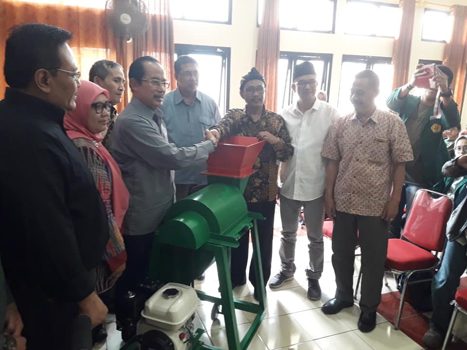 Rektor Unpas Prof. Dr. Ir. H. Eddy Jusuf Sp, M.Si., M.Kom menyerahkan mesin pemecah sampah plastic dan alat kebersihan lainnya kepada Sekretaris Camat Kutawaringin dan Kepala Desa Jelegong.*