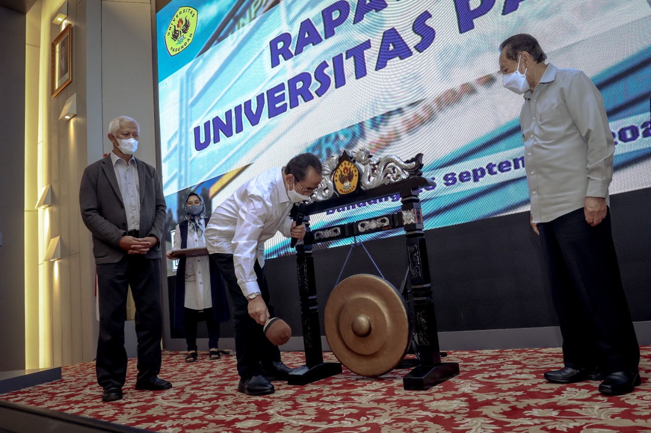 BANDUNG, unpas.ac.id – Rektor Universitas Pasundan Prof. Dr. Ir. H. Eddy Jusuf Sp, M.Si., M.Kom., IPU., memukul gong empat kali sebagai tanda syukur atas terlampauinya target 4.000 mahasiswa baru Unpas tahun akademik 2022/2023.