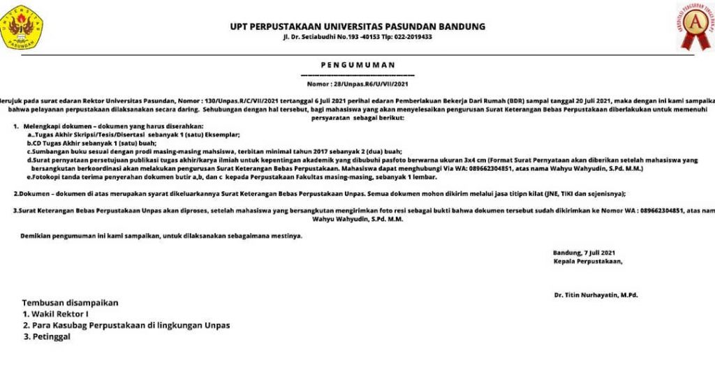 “Format surat pernyataan akan diberikan setelah mahasiswa yang bersangkutan berkoordinasi untuk mengurus Surat Keterangan Bebas Perpustakaan,” jelas Kepala Perpustakaan Pusat Unpas Dr. Titin Nurhayatin, M.Pd.