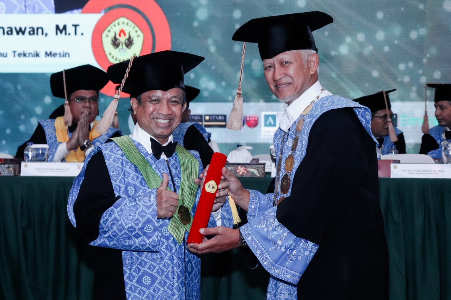 Guru Besar Bidang Ilmu Pendidikan Biologi Prof. Dr. Cartono, S.Pd., M.Pd., M.T. dan Guru Besar Bidang Ilmu Teknik Mesin Prof. Dr. Ir. Hery Sonawan, M.T. (Foto: Rico B)