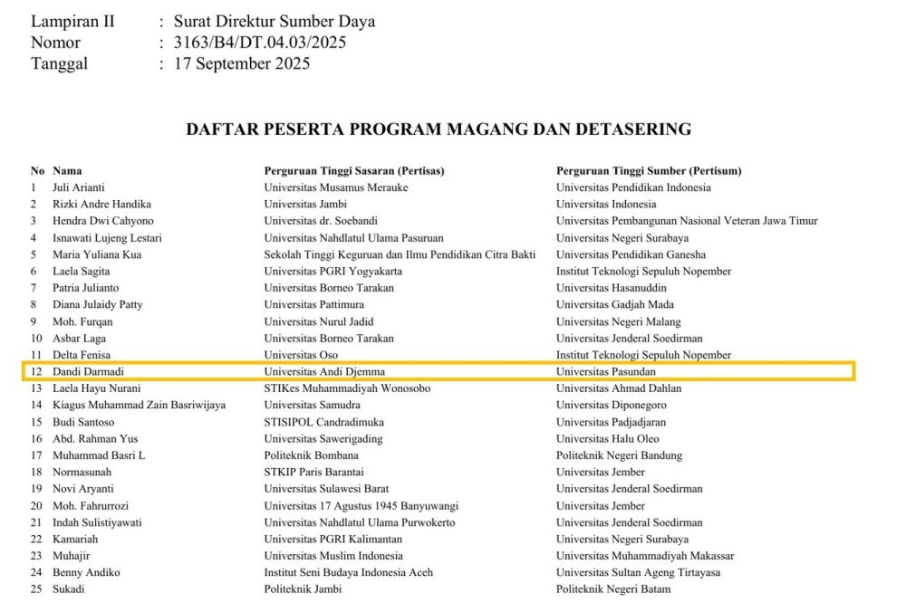 Daftar Peserta Program Magang dan Detasering 2025. (Foto: Istimewa)