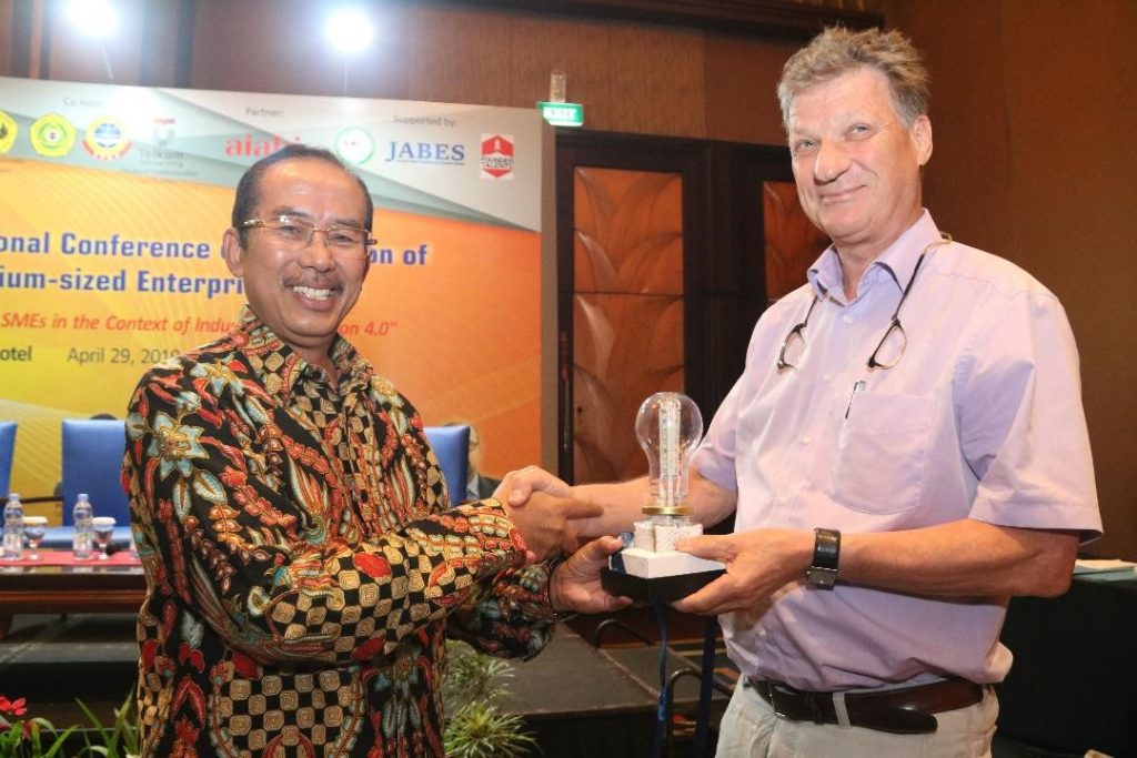 Rektor Unpas Prof. Dr. Ir. H. Eddy Jusuf Sp, M.Si., M.Kom memberikan cendera mata kepada pemateri pada Seminar Internasional Usaha Kecil dan Menengah (The Ist International Conference on Innovation of Small Medium-sized Enterprise – ICIS), Senin, 29 April 2019, di Hotel Elroyale, Jalan Merdeka, Bandung.